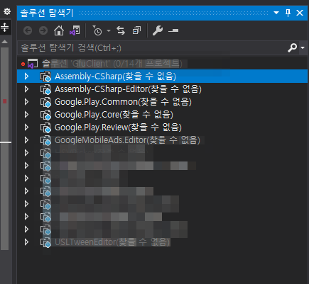 솔루션 탐색기에서는 (찾을 수 없음)이라고 나왔다. 참조가 문제가 생긴 상황이다.