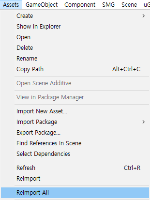 [Assets]-[Reimport All]을 해서 프로젝트를 다시 import 진행한다.