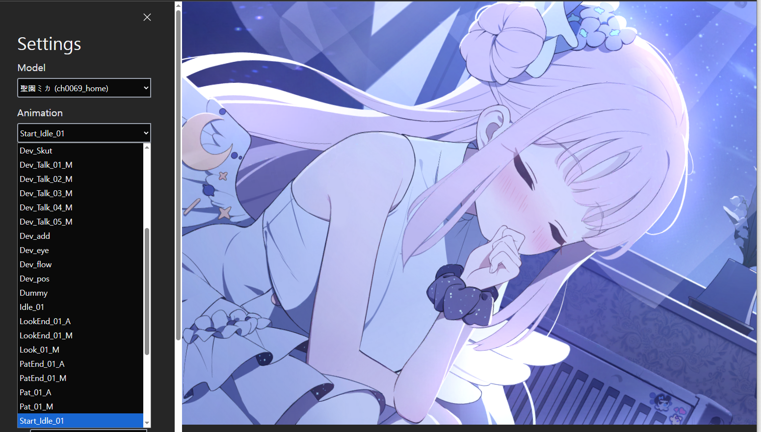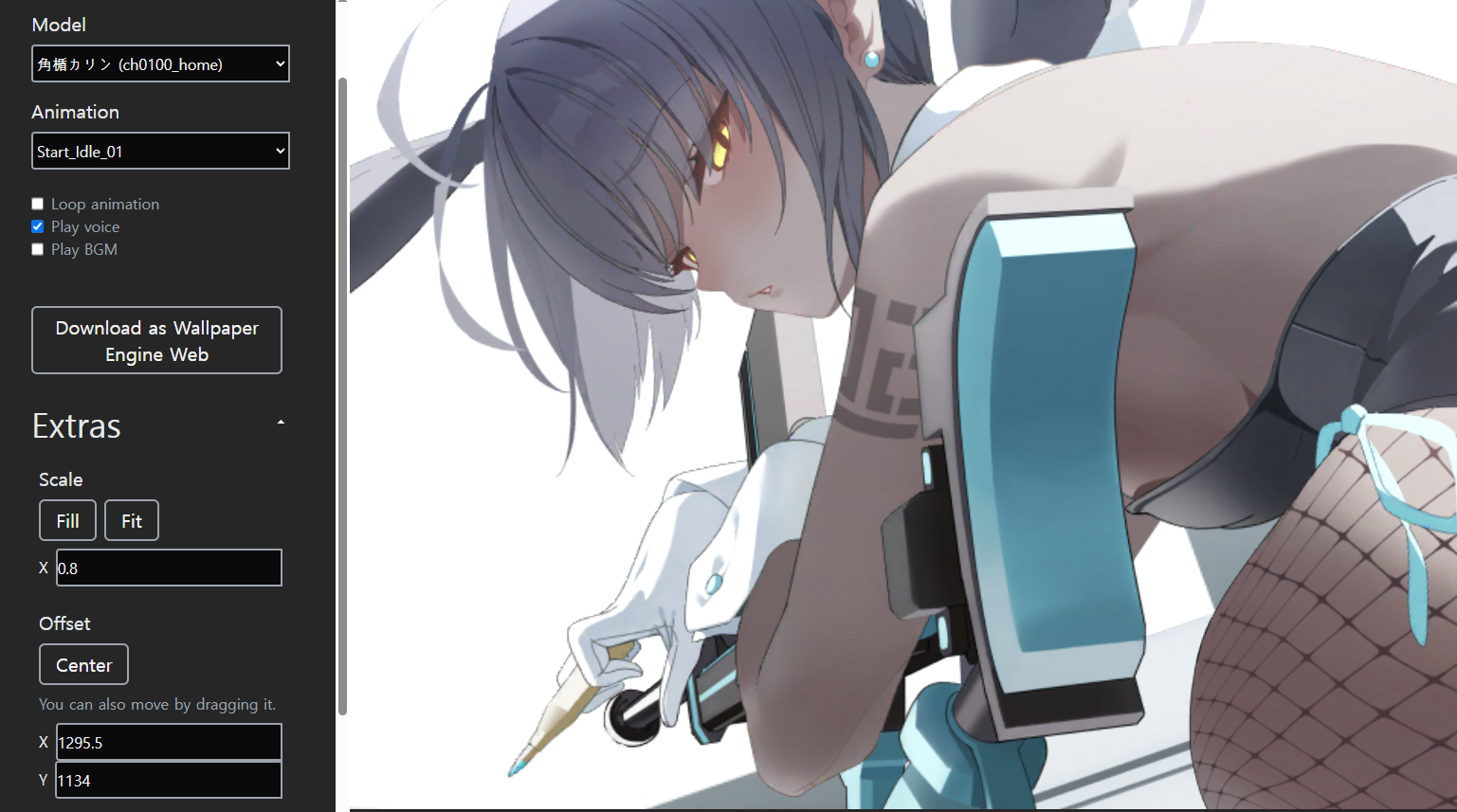 Model, Animation, Voice, BGM, Scale 및 Offset 좌표가 선택이 가능하다.