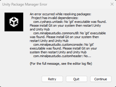 해당 문제는 UniTask 패키지를 가져오는 과정에서 Git 을 찾지 못해서 발생한 이슈이다.