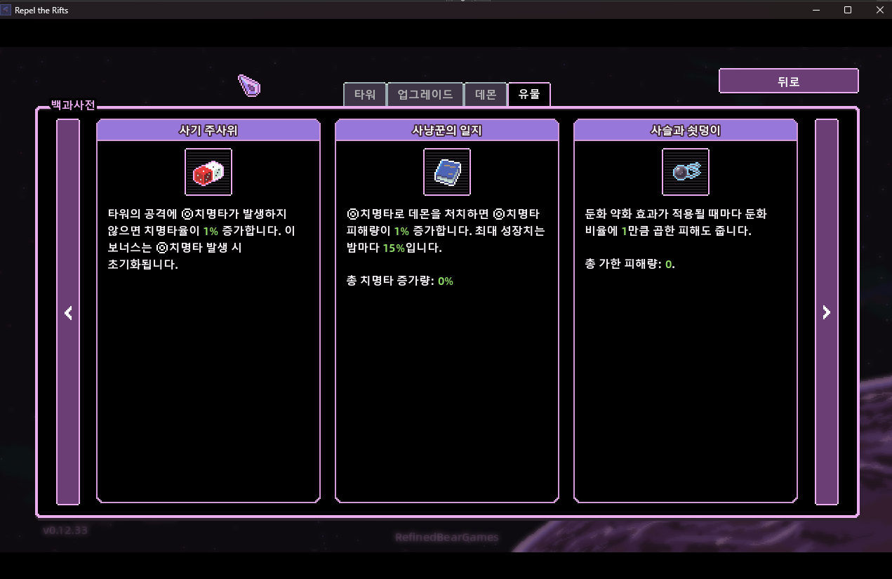 타워의 업그레이드를 계속하고 시너지를 확인하고 다회차 플레이를 할 정도로 꽤나 재미있는 게임이다.