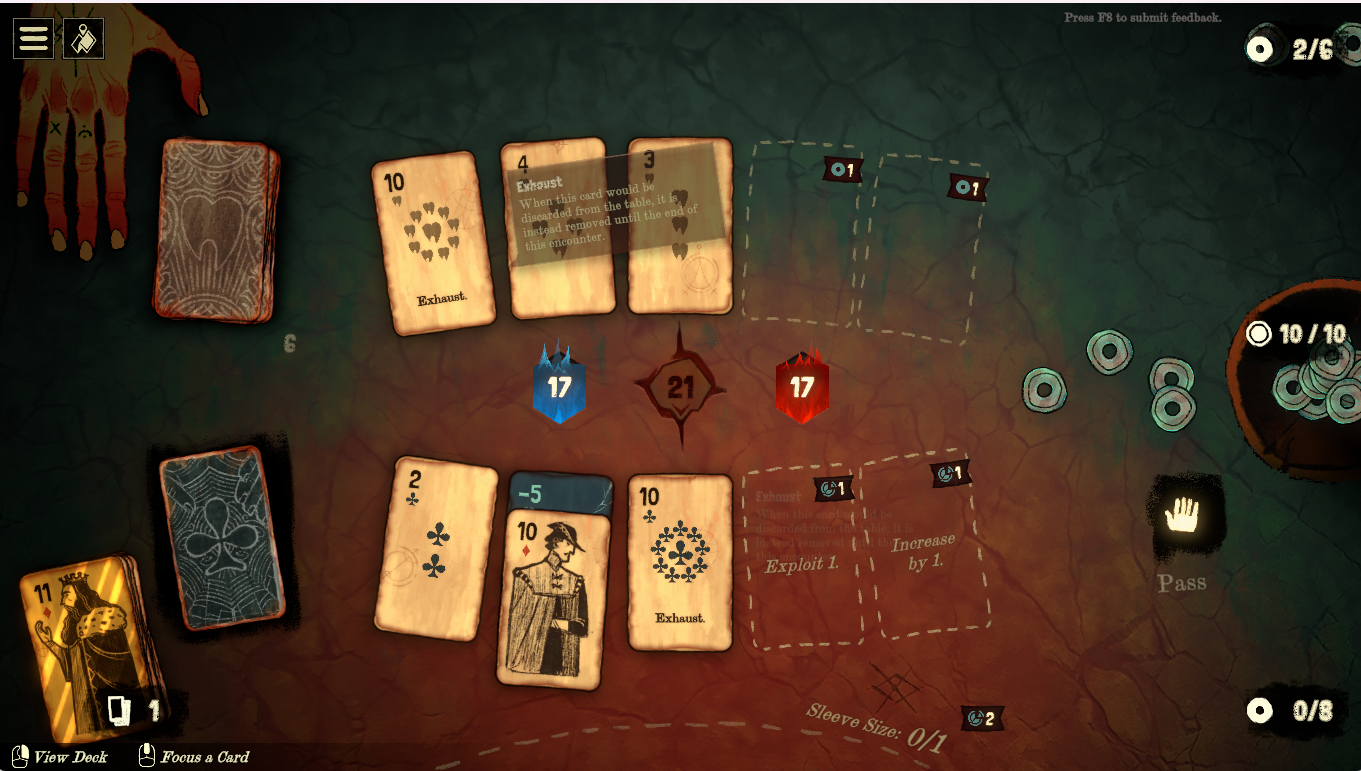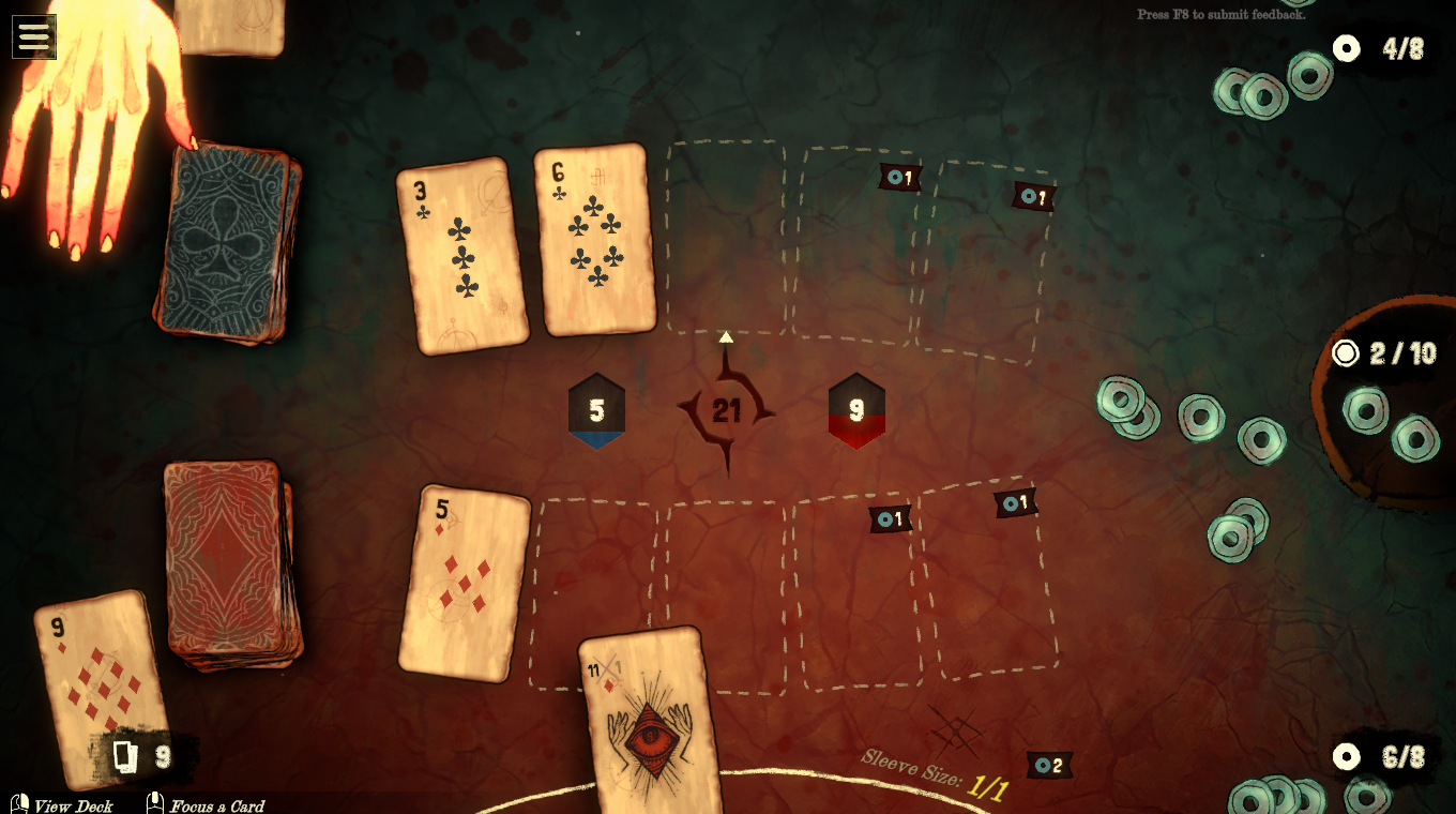 블랙잭을 가지고 진행하는 전략 게임이다. 특수카드들과 효과들을 전략적으로 잘 활용해서 진행해야 한다.