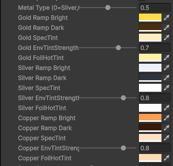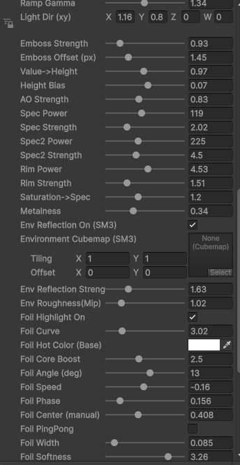 기본적으로 Texture에 Main Ramp Bright / Dark 형태의 컬러와 요철(엠보싱) 효과와 금속 포일 (하이라이트)를 추가로줘서