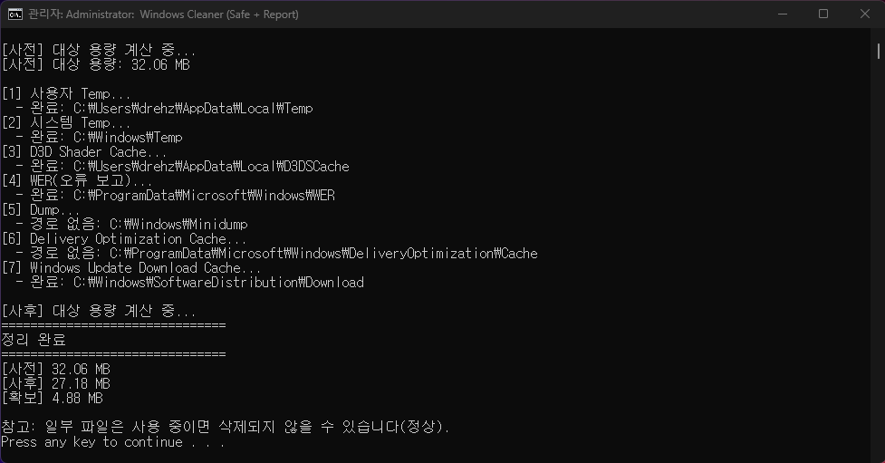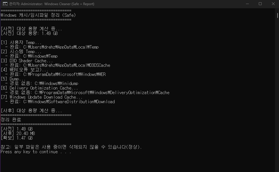 모두 삭제해도 시스템 동작에 영향이 없는 캐시/로그만 포함하게 작업했다.