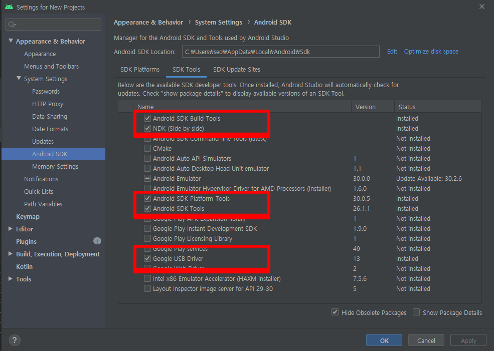 SDK Tools - Android SDK Build-Tools / NDK / Android SDK platform-Tools / Adnroid SDK Tools / Google USB Driver