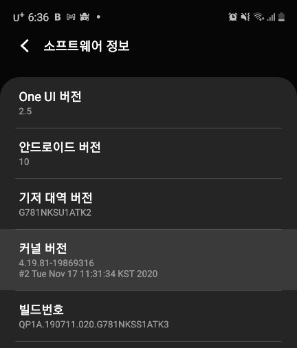 핸드폰 - 설정 - 휴대전화 정보 - 소프트웨어 정보에 들어가면 빌드번호라는 항목이 있는데