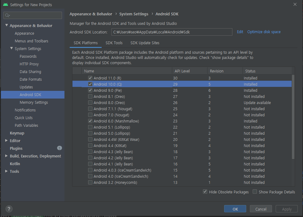 [Tools]-[SDK Manager] 메뉴에서 설치 항목을 체크하고 Apply 한다.