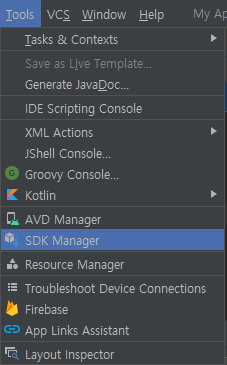 안드로이드 스튜디오에 들어가면 SDK Manager를 실행해서 관련된 Tool을 설치해야 한다.